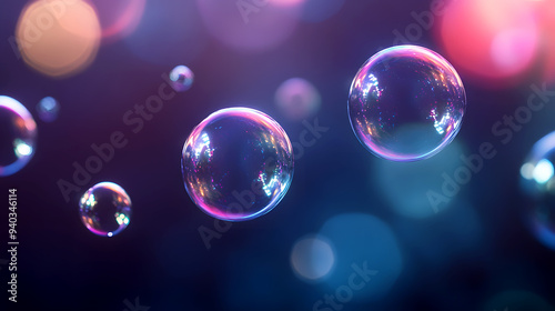 Abstract Artistic Soap bubbles floating in an abstract, artistic space with a dark, blurred background. The bubbles are illuminated by a single light source