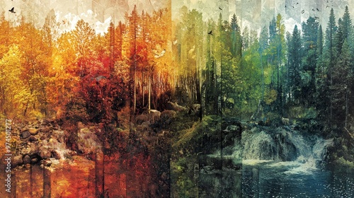 Abstract Autumn Forest and Waterfall with Birds and Deer