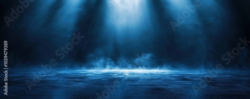 Abstract background of dark blue with light rays and mist, spotlight on an asphalt floor for display products. Dark scene with reflections from the water surface