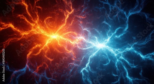 Abstract background of intense electrical discharge clash between opposing red hot and cold blue lightning energy streams