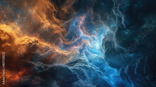 Abstract background of swirling nebulae and stars with two vibrant cosmic clouds colliding in a spectacular display of light and color