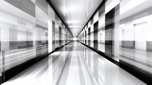 Abstract black and white geometric hallway with reflective surfaces and symmetrical design. Ideal for modern, futuristic, or architectural themes
