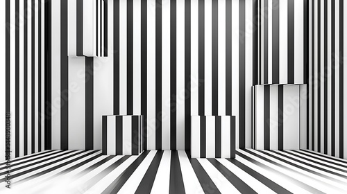 Abstract Black and White Striped Room with Geometric Cubes: A Study in Minimalist Design
