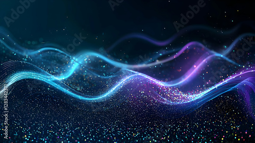 Abstract Blue And Purple Wavy Digital Data Stream With Particle Light Over Dark Background