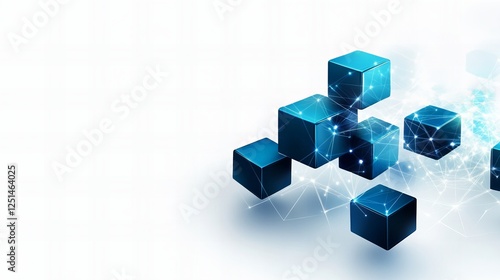 Abstract blue cubes connected by glowing lines against a white background. Digital technology concept.