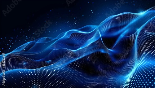 Abstract blue digital wave on a dark background, sound waves with dots and lines