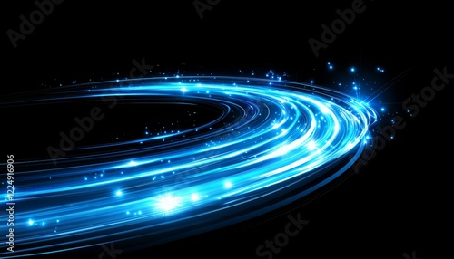 Abstract Blue Light Trails on a Curved Path with Sparkling Effect on Black background