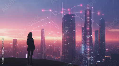 Abstract business woman stands on Smart digital Innovation city with connection network reciprocity over the twilight cityscape. of future wireless digital city and social media networking systems