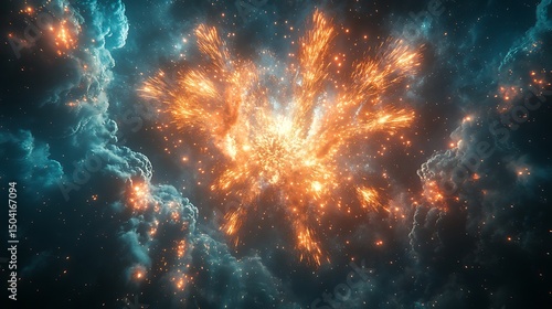 Abstract celestial fireworks explosion in the vast universe amidst ethereal azure and orange photo