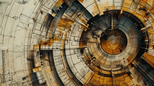 abstract, circular, geometric, mechanical, design, structure, engineering, technology, futuristic, complex, pattern, line, form, texture, detail, intricate, interconnected, symmetry, modern, art, illustration, perspective, visual, composition, layer, depth, space, orange, brown, beige, aged, vintage, rust-eaten, architecture, patterned, concept, digital, graphic, innovation, system, engineered, blueprint, urban, urbanism, city, industrial, future