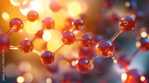 Abstract close-up of a molecular structure with glowing atoms, representing scientific innovation and research in chemistry and biochemistry.