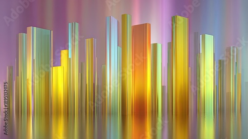 Abstract colorful city skyline with reflective metallic textures creating a vibrant and dynamic atmosphere under colorful gradient background