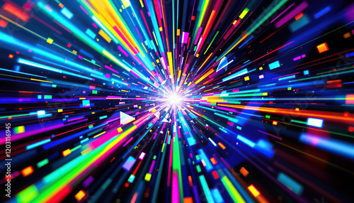 abstract, colourful, light, streak, exploding, center, bright, vibrant, neon, glowing, dynamic, energy, motion, speed, fast, ray, line, beam, shape, geometric, pattern, background, texture, design, art, graphic, illustration, digital, futuristic, technology, science, space, cosmos, galaxy, star, pixel, particle, kaleidoscope, hallucinogen, rainbow, spectrum, colours, high-coloured, intense