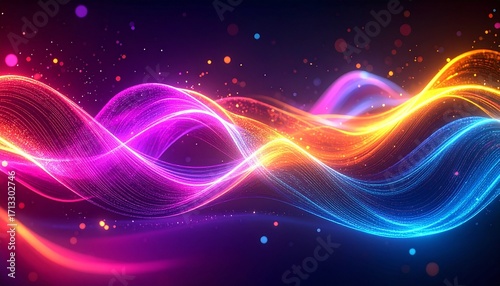 Abstract Colorful Neon Light Waves with Glowing Energy Lines and Particles on Dark Background
