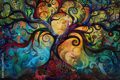 Abstract Colorful Tree of Life with Vibrant Patterns and Artistic Elements