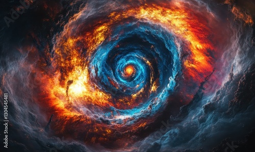 Abstract cosmic storm with vibrant swirling colors of blue, red, and orange, glowing with dynamic energy and texture, .