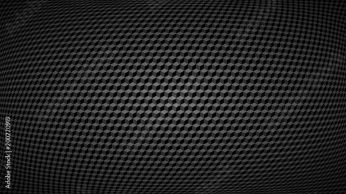 Abstract dark background of small isometric cubes in shades of black and gray colors with the fish eye effect.