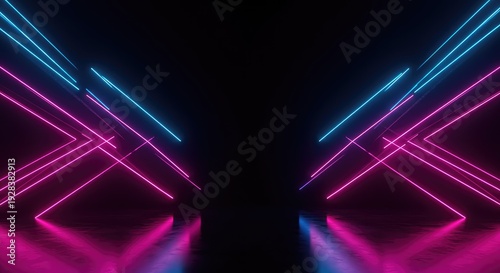 Abstract dark digital background featuring bright pink and blue neon glowing geometric lines creating a futuristic pattern display, blue, synthwave, modern