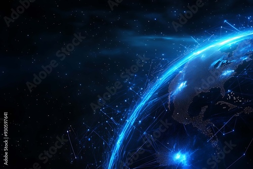 Abstract digital background banner featuring the Earth with data connection elements in blue and black colors