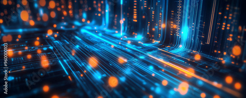 Abstract digital background with glowing blue and orange lines and particles.