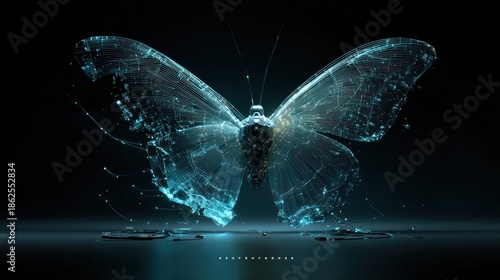 butterfly, digital, abstract, technology, futuristic, blue, glowing, network, line, wing, symmetry, design, illustration, cyber, cyberspace, communication, innovation, creative, art, graphic, light, dark, background, concept, datum, connection, structure, three-dimensional, render, modern, visualisation, artificial, intelligence, isolated, space, texture