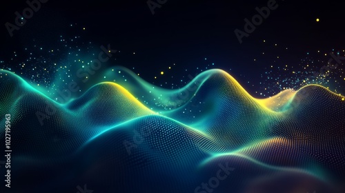 abstract, digital, landscape, dot, line, glowing, neon, blue, green, yellow, dark, background, pattern, texture, futuristic, technology, modern, design, graphic, art, illustration, concept, motion, wave, ripple, flow, energy, vibrant, dynamic, space, galaxy, cosmic, light, shimmer, blur, soft, smooth, aethereal, magical, subtile, depth, perspective
