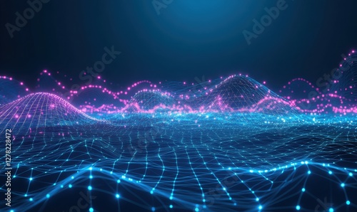 Abstract digital landscape with vibrant pink and blue waves, representing data flow and technology