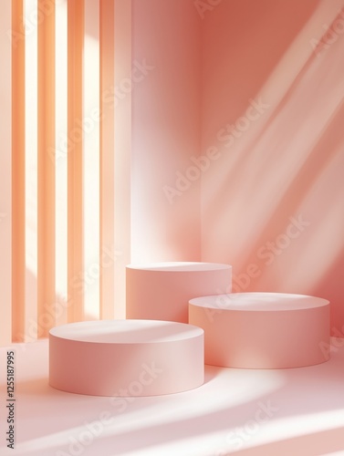 Abstract display with cylindrical platforms in pastel peach hues