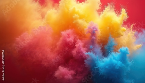 Abstract explosion of colorful powders yellow blue pink red against deep red backdrop. Dynamic creative art forms burst, mix creating vibrant visual texture. Energetic splash effect suitable for