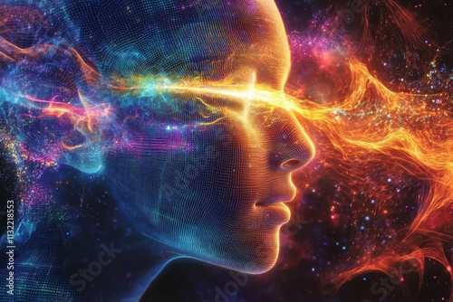 digital, face, energy, abstract, glowing, cosmic, nebula, particle, vibrant, colours, light, dark, mystical, aethereal, futuristic, head, portrait, science, technology, fantasy, imagination, surreal, dreamlike, vision, aura, flow, motion, connection, spark, universe