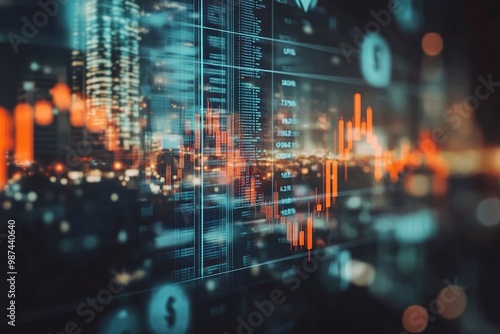 Abstract falling candlestick forex graph and dollar on blurry city wallpaper. Crisis and finance concept. generative ai