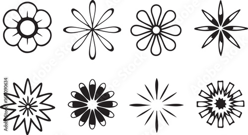 flower, icon, set, graphic, abstract, ray, flourish, sunbeam, celestial, burst, tattoo, shine, glow, motif, star, ornament, pop, flare, spark, silhouette, twinkle, insignia, sunburst, infographic, geometric, starburst, glimmer, elegant, ornamental, print