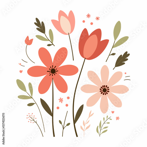 Abstract flowers, top view. Spring flora. Flat vector illustration on white background