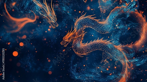 Abstract flying dragons on a dark blue backdrop with a tech-inspired AI theme
