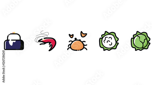 drawing, cartoon, food, shrimp, pot, crab, cabbage, fruit, vegetable, nourishment