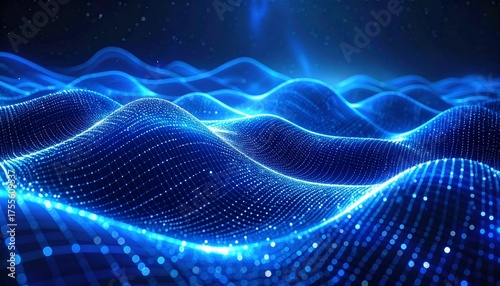 Abstract futuristic background with flowing digital data waves and glowing blue neon particles on a network grid