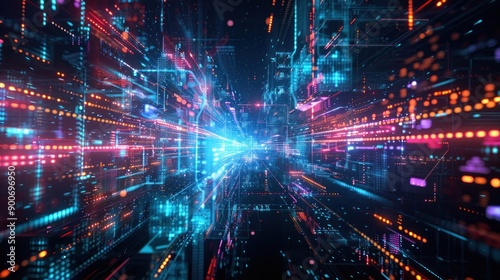city, futuristic, neon, light, datum, abstract, technology, digital, network, glowing, vibrant, urban, modern, grid, line, structure, city landscape, concept, background, design, illustration, style, graphic, art, dark, space, pattern, texture, colours, blue, red, orange, purple, pixel, blur, motion, speed, flow, energy, power, connection, future, progress, innovation, vision, imagination, dream
