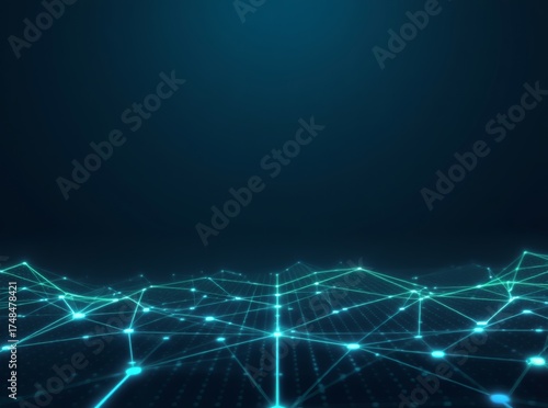 Abstract futuristic technology background featuring a glowing blue digital network of interconnected data points on a dark surface