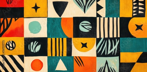 abstract, geometric, patchwork, colourful, art, design, shape, square, circle, triangle, line, stripes, pattern, texture, paint, canvas, background, vibrant, bold, modern, contemporary, style, graphic, illustration, teal, orange, yellow, black, white, beige, cream, artistic, creative, expression, visual, composition, element, palette, artwork, aesthetic, hand-painted