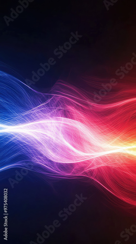 Abstract glowing lines that merge in vibrant colors create stunning visual effect, blending shades of blue, purple, red, and orange against dark background. dynamic flow evokes sense of energy and mov