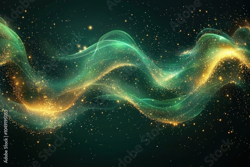 green, gold, abstract, sparkle, background, swirl, wave, glistering, shimmer, shine, light, bright, dark, night, cosmic, space, nebula, galaxy, star, dust, motion, dynamic, elegant, festive, luxurious, celebratory, pattern, texture, digital, art, graphic, design