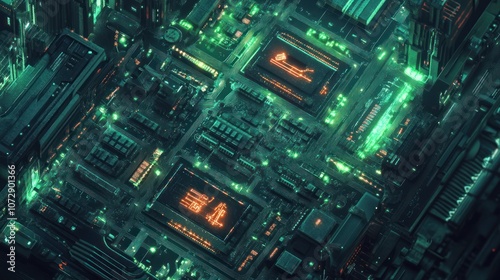 Abstract green and orange glowing circuit board with integrated circuits and microchips.