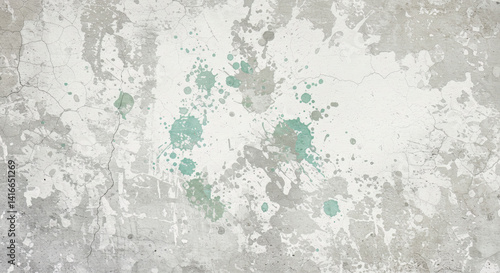 Abstract Grunge Texture: Cracked Concrete Wall with Pastel Green and Gray Paint Splatter