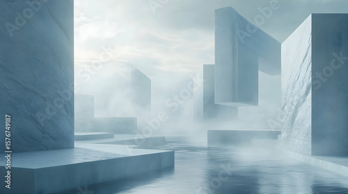 abstract, digital artwork, icy, landscape, geometric, structure, mist, fog, water, reflective, blue, grey, pale, cool, aethereal, surreal, tranquil, isolated, modern, minimal, artistic, design, atmosphere