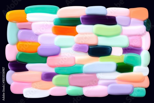 Abstract image of colorful paint strokes arranged in a brick-like pattern against a black background.