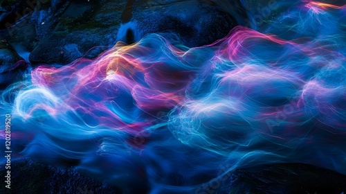 light, trail, flowing, rock, dark, abstract, blue, pink, purple, neon, glowing, wave, energy, motion, vibrant, cosmic, aethereal, mystical, fantasy, dreamy, texture, pattern, line, curve, swirl, streak, night, water, river, stream, landscape, art, design, background, illustration, digital, graphic, colours, style, bright, illuminated