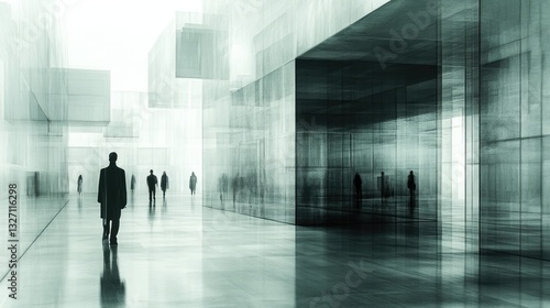 Abstract modern architecture interior with people, photorealistic, empty corridor, possible use for advertising, or design inspiration