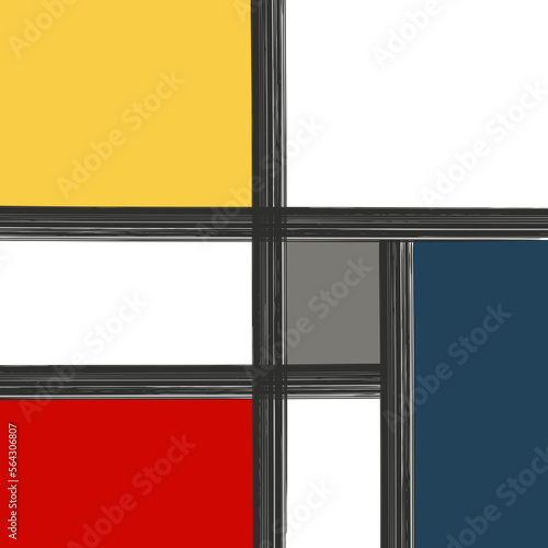 Abstract modern art with colorful (red, grey, dark blue, yellow, white) rectangles and black grunge lines in Mondrian style on white background