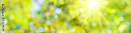 Abstract natural image, sun rays, green blurred background. Horizontal image bright sun on blurred natural background.