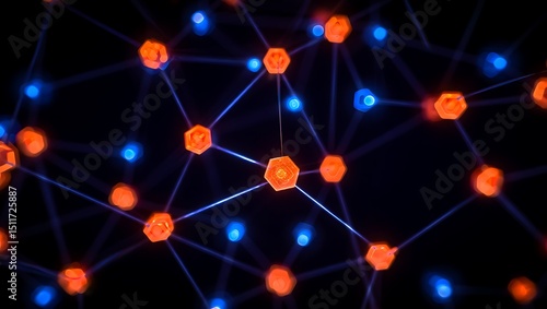 Abstract Network of Orange Hexagons and Blue Spheres Connected by Lines on a Dark Background Representing Technology Communication and Interconnectivity in a Modern and Futuristic Style
